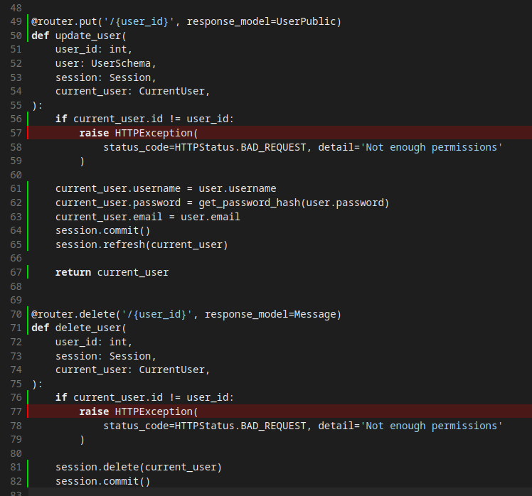 No código apresentado, se observarmos atentamente, vemos que o erro HTTPException(status_code=HTTPStatus.BAD_REQUEST, detail='Not enough permissions') em users.py na rota /{user_id} não está sendo coberto por nossos testes. Essa exceção é lançada quando um usuário não autenticado ou um usuário sem permissões adequadas tenta acessar, ou alterar um recurso que não deveria.