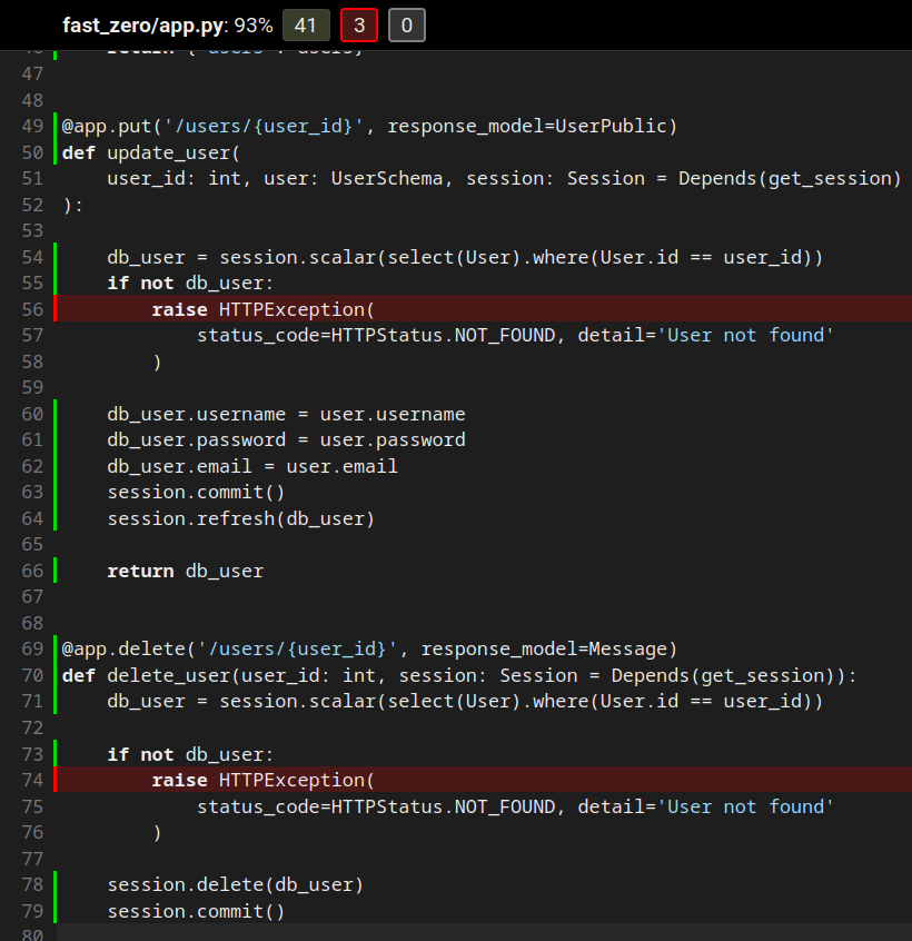 Com o banco de dados agora em funcionamento, podemos verificar a cobertura de código do arquivo fast_zero/app.py. Se olharmos para a imagem abaixo, vemos que ainda há alguns casos que não testamos. Por exemplo, o que acontece quando tentamos atualizar ou excluir um usuário que não existe?