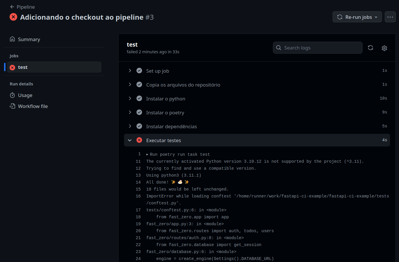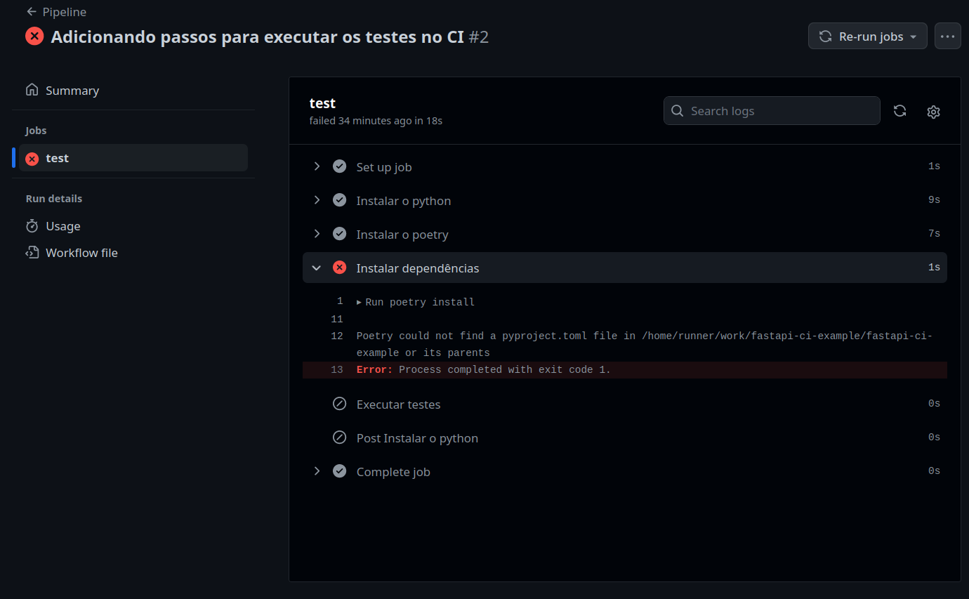 Se analisarmos com calma o resultado, veremos que a execução do nosso workflow apresenta um erro de execução. O erro está descrito na linha 12: Poetry could not find a pyproject.toml file in <path> or its parents. Se traduzirmos de maneira literal, a linha nos disse Poetry não encontrou o arquivo pyproject.toml no <path> ou em seus parentes.