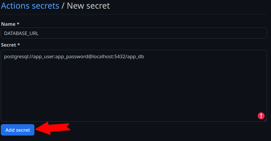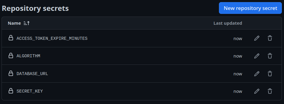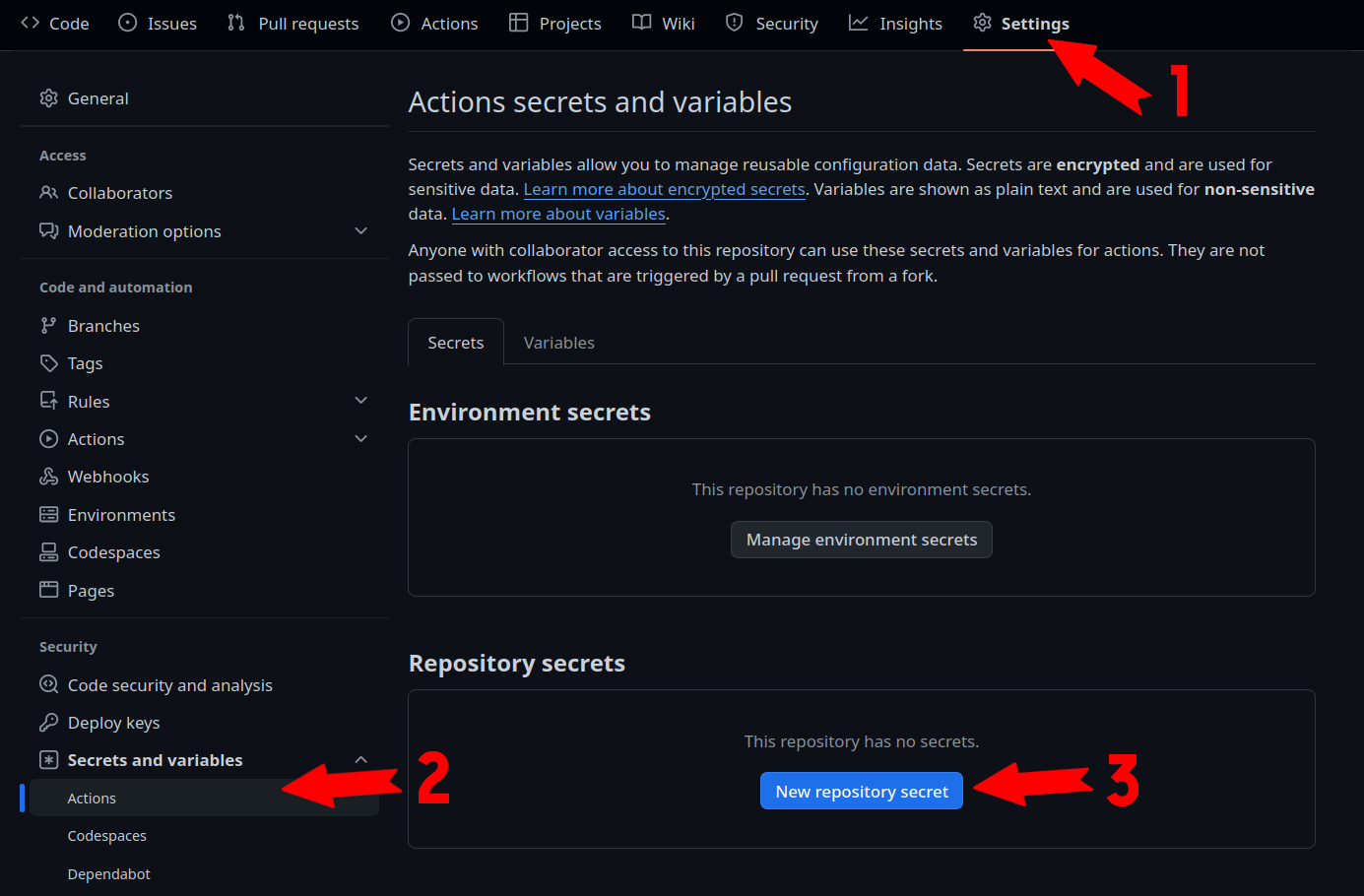 Acesse Settings no seu repositório GitHub. Em seguida clique na guia "Secrets and variables". Após isso clique em "New Repository secret":