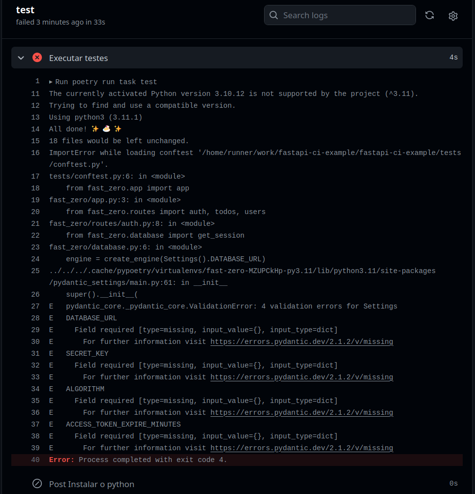 Ao iniciar a execução dos testes, encontramos um erro relacionado à nossa classe settings.Settings. Isso ocorreu porque as variáveis de ambiente necessárias, como DATABASE_URL, não estavam definidas no workflow do CI. Este problema é comum quando as variáveis do arquivo .env, que utilizamos localmente, não são transferidas para o ambiente de CI.
