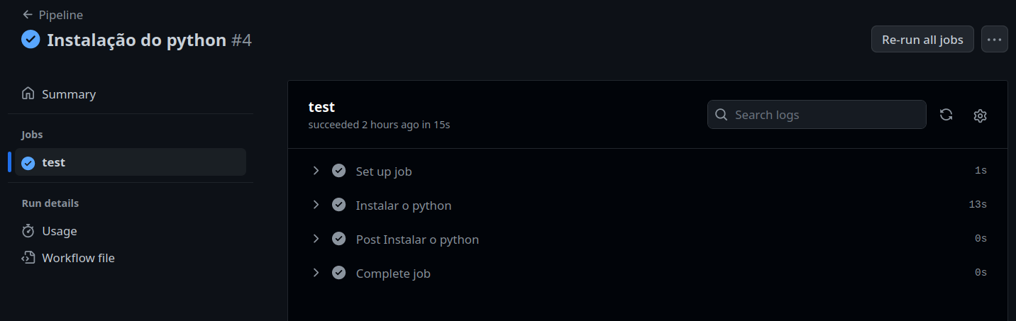 Isso nos mostra que tudo que configuramos no arquivo pipelines.yaml foi executado pelo actions no momento que em executamos um push no git.